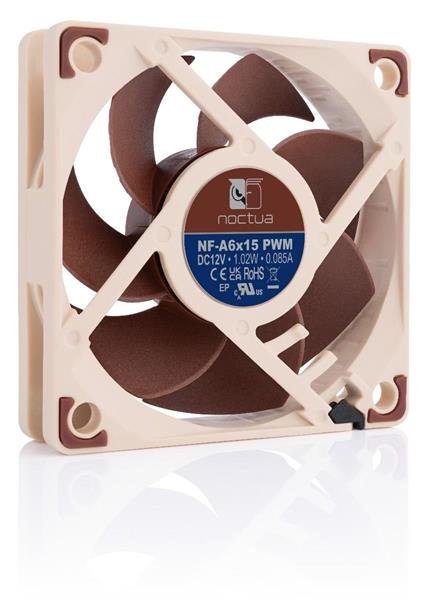 NF-A6x15 je vysoko optimalizovaný tichý ventilátor prémiovej kvality s rozmermi 60x15 mm, ktorý je vybavený pokročilými aerodynamickými konštrukčnými opatreniami, ako sú kanály na zrýchlenie prúdenia a rám Noctua AAO. Verzia PWM využíva špeciálne navrhnutý integrovaný obvod NE-FD1 spoločnosti Noctua na plne automatické riadenie otáčok prostredníctvom 4-pinových záhlaví ventilátora a dodáva sa s adaptérom Low-Noise Adaptor na zníženie maximálnych otáčok počas riadenia PWM z 3500 na 3050 ot/min. Jeho vynikajúca plynulosť chodu, ložisko SSO2 a dôveryhodná prémiová kvalita spoločnosti Noctua z neho robia elitnú voľbu pre najvyššie nároky.