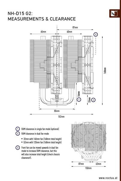 Väčší výkon, menšie rozmery - Vďaka vyššej hustote rebier, ktorú umožňujú nové ventilátory NF-A14x25r G2, ako aj asymetrickým komínom rebier a o niečo menšej medzere medzi komínmi, kombinuje verzia G2 lepší výkon s o niečo menšími rozmermi v porovnaní s pôvodným NH-D15 (o 9 mm menšia hĺbka chladiča, rovnaká šírka chladiča, rovnaká celková výška vrátane ventilátorov).