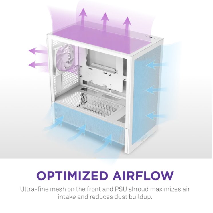 High-Airflow Design: Ultra-fine steel mesh panels and a ventilated PSU shroud maximize airflow while effectively filtering out dust.