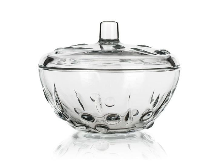 Dóza s víkem PERLA 14 cmDóza se skleněným víkem PERLA 14 cm na ukládání drobných sladkostí. Vyrobeno z kvalitního čirého skla reliéfem.