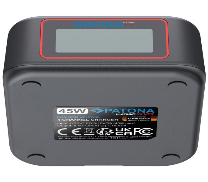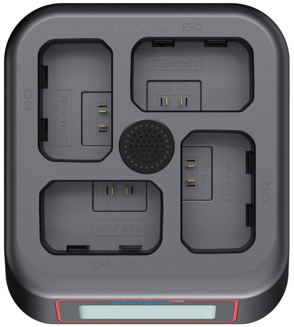 Profesionální 4-portová nabíječka PATONA pro baterie Sony NP-FW50 s Power Delivery a USB-C. Nabíjí až 4 baterie současně, LCD displej, ochrana proti přehřátí a přebíjení, rychlé nabíjení 8,4 V/1,6 A, kompaktní rozměry.