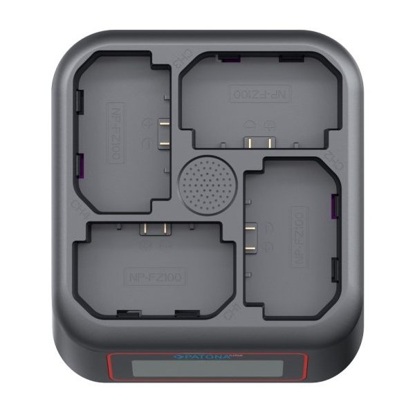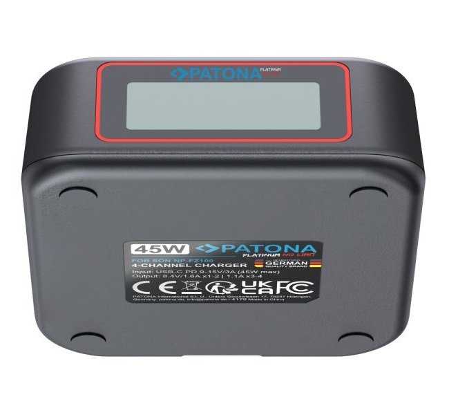 Profesionální 4-portová nabíječka pro baterie Sony NP-FZ100 s podporou Power Delivery a rychlého nabíjení. USB-C vstup s max. výkonem 45 W, LCD indikace stavu nabíjení, ochrana proti přehřátí a přebíjení, kompaktní rozměry 11,5 × 7 × 1,9 cm.