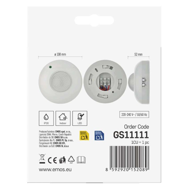 citlivosť: <3 Lux|ďalšie funkcie: –|detekčný dosah: 6 m|detekčný uhol: 360°|doba zopnutia: min. 10 sekúnd – max. 15 minút|farba: biela|hlasová komunikácia: –|inštalačný materiál: –|jazyky aplikácie: –|kompatibilita: –|krytie: IP20|max. záťaž kapacitná: 600 W|max. záťaž odporová: 1 200 W|napájanie: 220–240 V~|notifikácie do mobilnej aplikácie: –|ovládanie hlasovými asistentmi: –|podporované OS: –|predajný obal: 1 ks, krabička|prenosová frekvencia: –|produkt: pohybové čidlo|protokol: –|rozmer: 108 × 108 × 52 mm|typ senzora: PIR|ukladanie na cloud: –|ukladanie na kartu SD: –