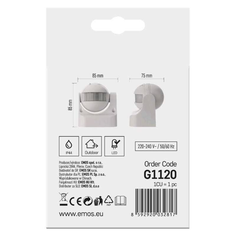 citlivosť: <3 Lux|detekčný dosah: 12 m|detekčný uhol: 180°|doba zopnutia: min.10 sekúnd – max. 7 minút|farba: biela|krytie: IP44|max. záťaž kapacitná: 300 W|max. záťaž odporová: 1200 W|napájanie: 230 V~/50 Hz|predajný obal: 1 ks, krabička|rozmer: 85 × 75 × 85 mm|typ senzora: PIR