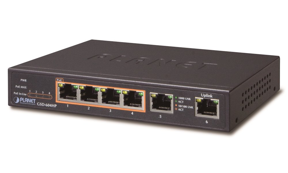 PLANET GSD604HP; Gigabitový přepínač 6 portů 1000BaseT z toho 4 porty s PoE injektorem 802.3at, napájecí výkon až 55W. Portové VLAN, ochrana proti smyčkám. Externí napájecí zdroj, kovové provedení, bez ventilát...