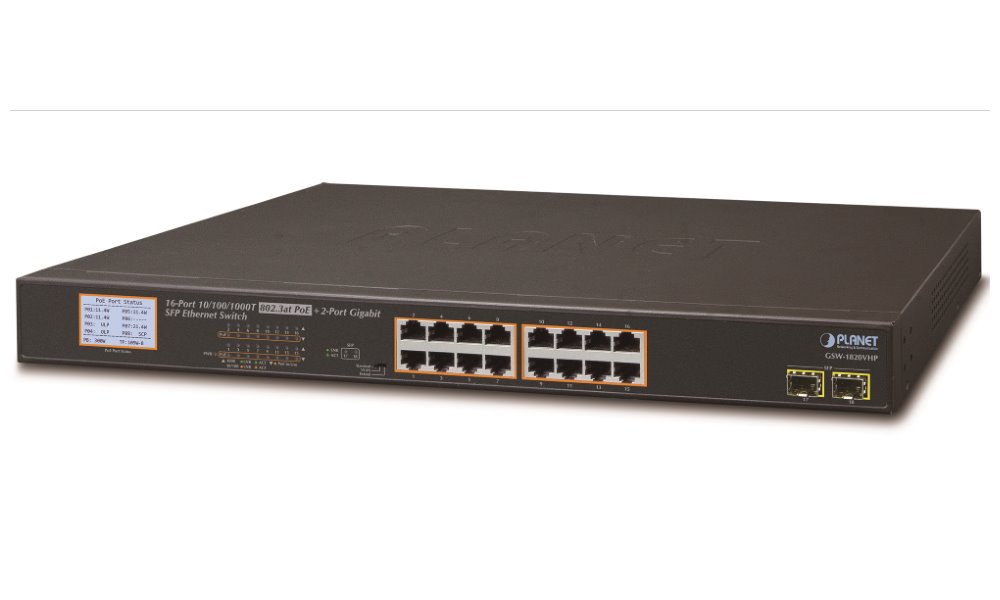 • Planet GSW-1820VHP PoE switch, 16x PoE +2x SFP 1000Base-X, LCD,VLAN, extend mód 10Mb-250m,IEEE 802.3at 300W