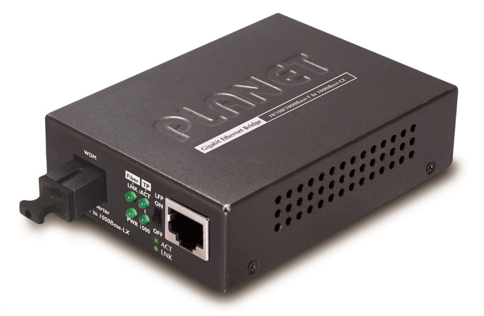 Konvertor pro přechod mezi jediným single módovým a metalickým spojem pro Gigabitový Ethernet. Spojení na 15km na straně single-módového vlákna, až 100m na straně metalického spoje.