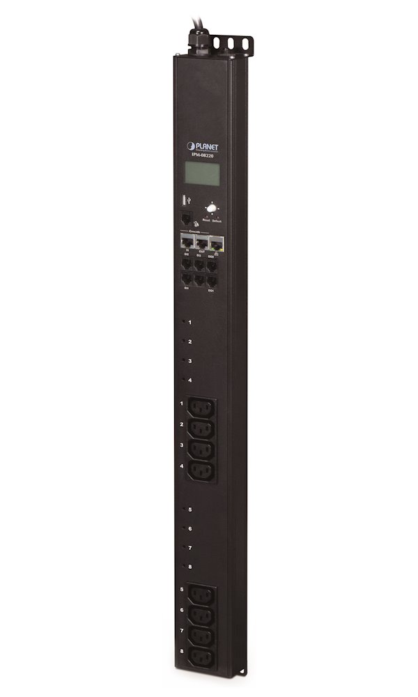 Planet IPM-08220, IP vertikální ovládání 8x zásuvek 240V/10A, 0U Rack, LED+displej, 2 kaskádové porty, port pro senzor