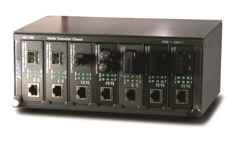 PLANET MC700; 7slotové šasi pro instalaci média konvertorů. Vnitřní napájení konvertorů, aktivní ventilace. Napájení AC 230 V, instalace 10" racku (výška 2U). Vlastnosti: 7 pozic pro st...
