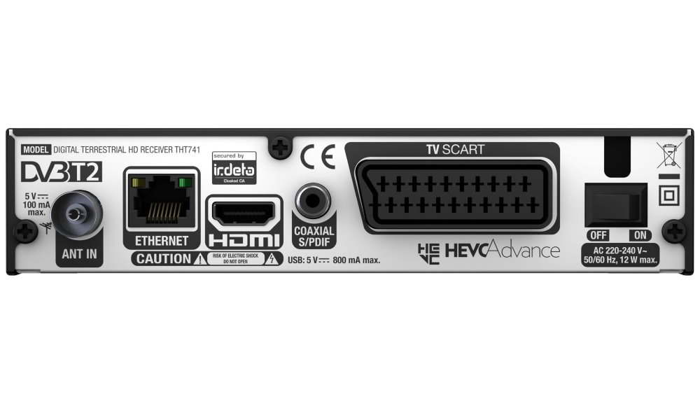 Thomson THT 741FTA; Settopbox s certifikací Českých Radiokomunikací (CRA) umožňuje příjem programů v normách DVBT a DVBT2 s podporou HEVC/H.265 a zpětně i H.264. Přijímač podporuje rozlišení Full...