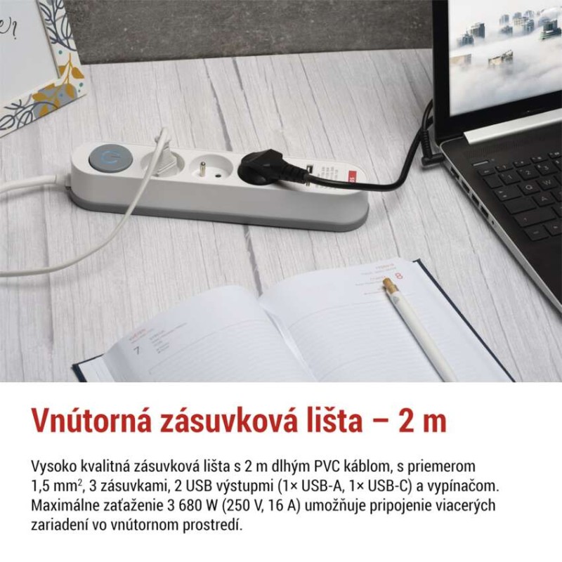 ďalšie funkcie: nie|detské clonky: áno|dĺžka: 2 m|farba: biela, šedá|jazyky aplikácie: –|kompatibilita: –|krytie: IP20|materiál zásuvky a vidlice: PC (polykarbonát)|max. záťaž: 3 680 W|napätie: 250 V~|notifikácie do mobilnej aplikácie: nie|ovládanie hlasovými asistentmi: nie|počet zásuviek: 3× 2P + PE|podporované OS: –|predajný obal: 1 ks, krabica|prenosová frekvencia: –|prierez vodiča: 1,5 mm2|protokol: –|prúd: 16 A max.|typ izolácie: PVC|USB výstup: 1× USB-A, 1× USB-C, total: 3,1 A – 15,5 W (fast charging)|vodič: H05VV-F3G|vypínač: áno