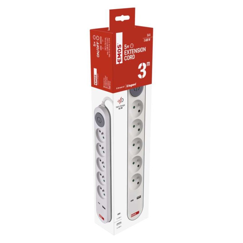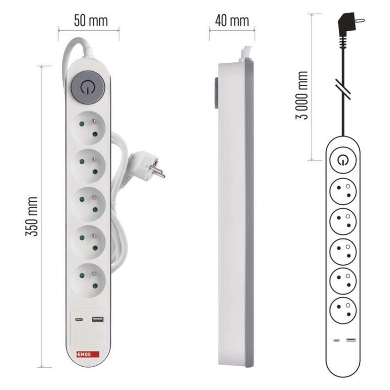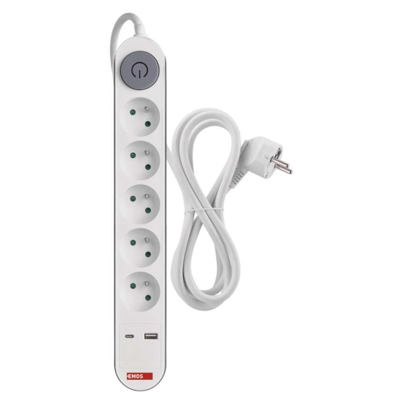 Predlžovací kábel 3 m / 5 zásuvky / s vypínačom / biely / 1×USB-A + 1×USB-C / 1,5 mm2 8592920132784