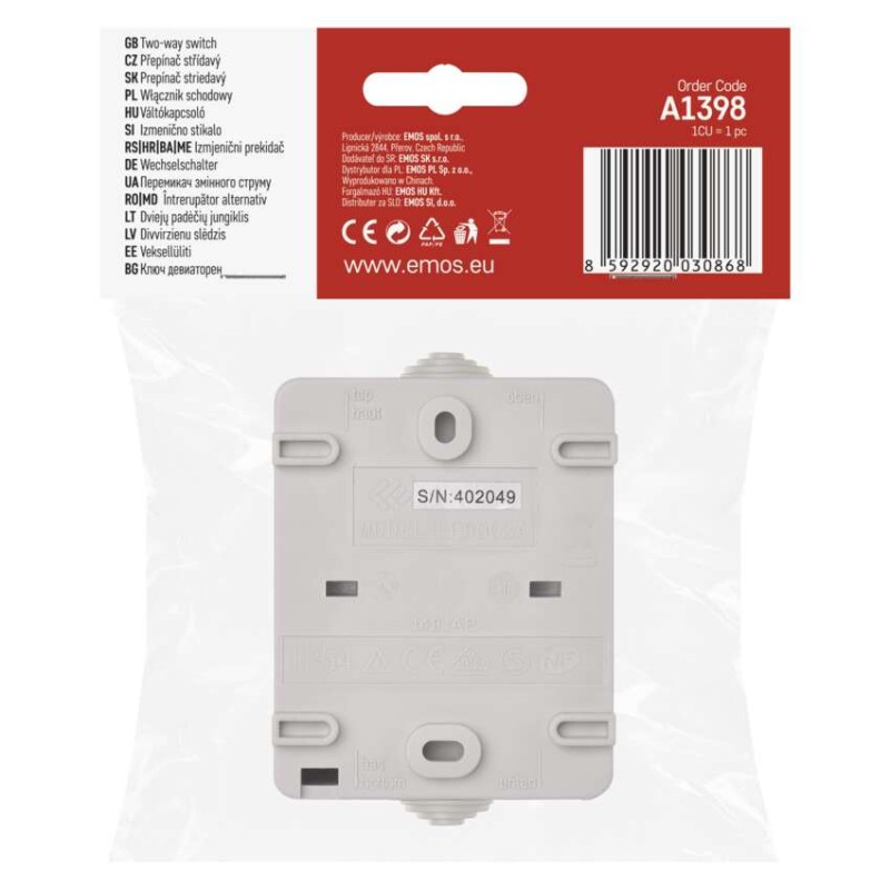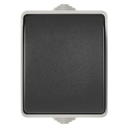 design: neuvádza sa|farba: šedo-čierna|krytie: IP54|predajný obal: 1 ks, PE sáčok|prevedenie: 1 tlač. schodiskový vodeodolný|produkt: spínač striedavý – č. 6|spôsob montáže: na stenu|typ: 250 V~/10 AX