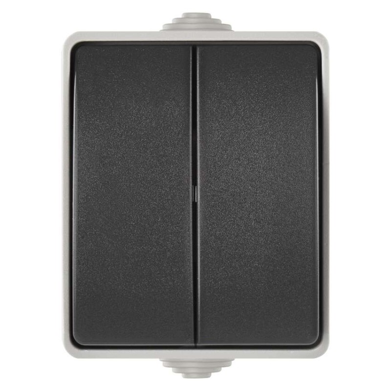 design: neuvádza sa|farba: šedo-čierna|krytie: IP54|predajný obal: 1 ks, PE sáčok|prevedenie: 2 tlač. klasický vodeodolný|produkt: spínač sériový č. 5 (lustrový)|spôsob montáže: na stenu|typ: 250 V~/10 AX