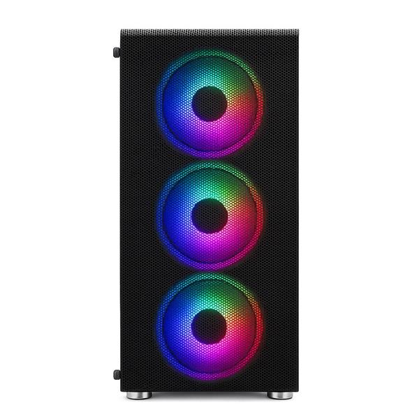 Štýlový dizajn skrinky so sieťovaným predným panelom umožňuje výhľad na 3 predné 12cm RGB LED ventilátory a zároveň zabezpečuje vynikajúce prúdenie a cirkuláciu vzduchu.