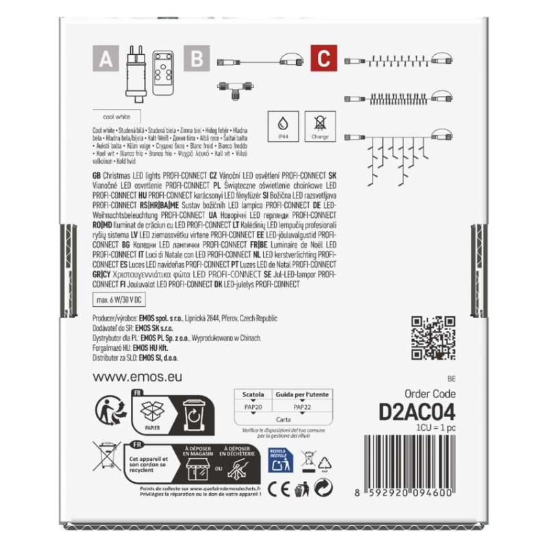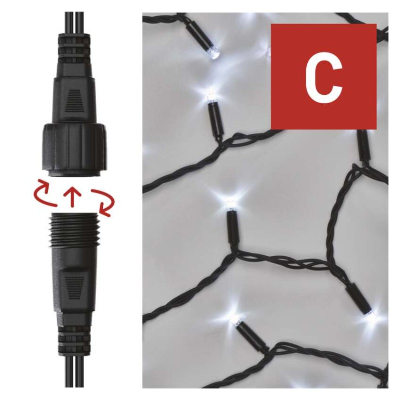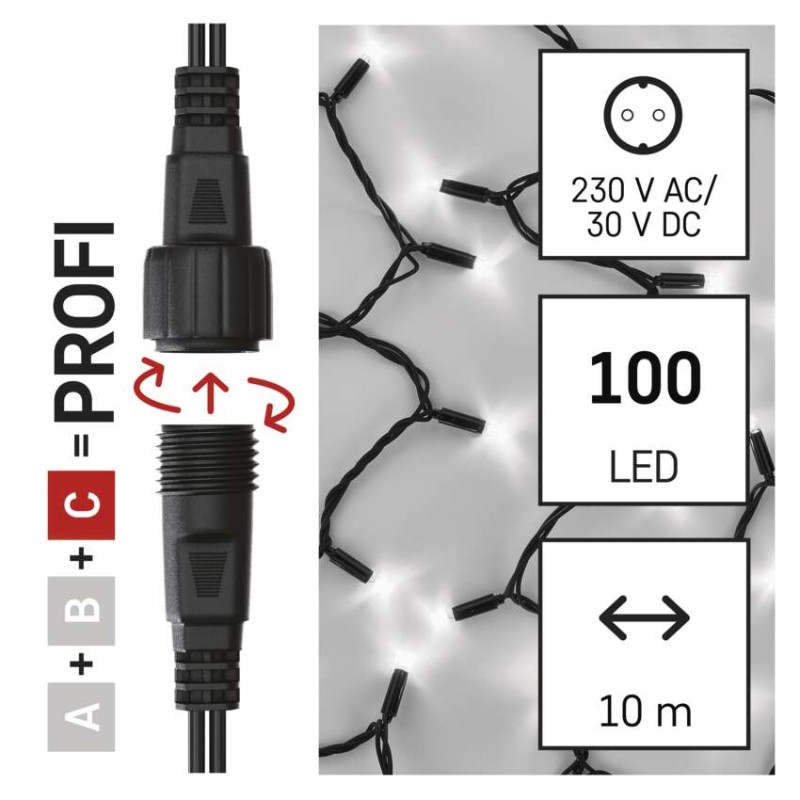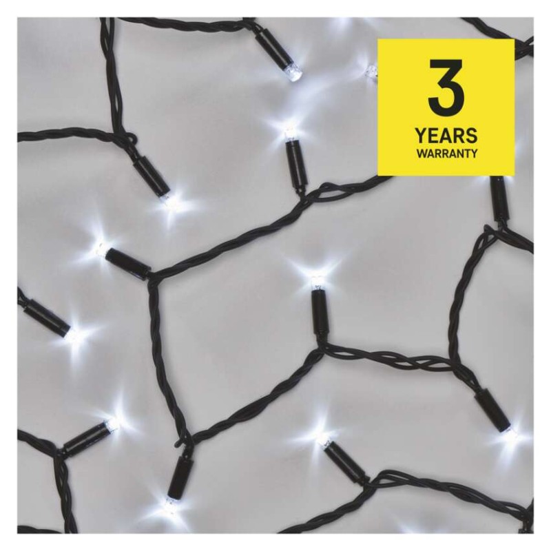 časovač: áno|diaľkový ovládač: nie|dĺžka prívodu: 10 cm|farba drôtu: čierna|farba svetla: studená biela|funkcia: svieti|krytie: IP44|LED medzera: 10 cm|materiál: guma|možnosť prepojenia: áno|počet LED: 100|použitie: vonkajšie aj vnútorné|predajný obal: 1 ks, krabica|pre výšku stromu: neuvádza sa|príkon: 0,9 W|produkt: reťaz|rozmer: 10 m|tvar: klasický|typ napájania: sieťový adaptér|veľkosť LED: 7 mm|vstupné napätie: 230 V AC|výstupné napätie: neuvádza sa|záručná doba: 2 roky|životnosť: 10 000 hodín