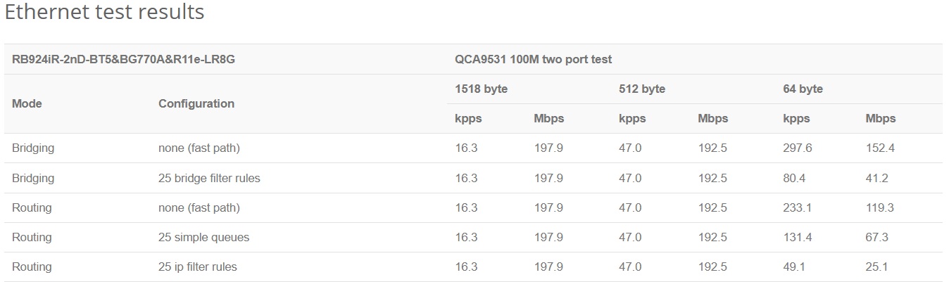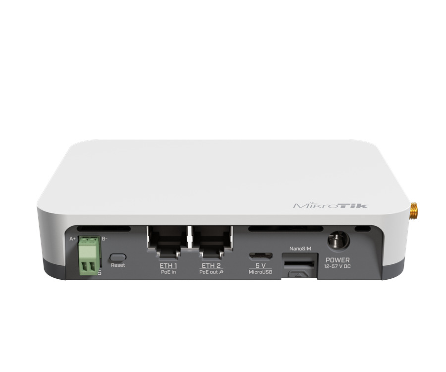 HARDWARE Architektura: MIPSBE CPU: QCA9531 (1 jádro, 650 MHz) RAM: 64 MB Úložiště: 128 MB NAND RouterOS licence: L4 Operační systém: RouterOS v7 Střední doba mezi poruchami: ~200 000 h při 25 °C Provozní teplota: -40 °C až 70 °C NAPÁJENÍ DC vstupy: 3 (DC jack, PoE-IN, MicroUSB) Napětí vstupu DC jack: 12–57 V Napětí vstupu PoE: 18–57 V PoE-in: 802.3af/at Napájení přes microUSB: 5 V Max. spotřeba: 23 W Spotřeba bez příslušenství: 6 W Chlazení: Pasivní POE-OUT PoE-out porty: Ether2 Typ PoE-out: Pasivní PoE Max. výstup (18–30 V): 650 mA Max. výstup (30–57 V): 450 mA Celkový výstupní výkon: 12 W WIRELESS (2.4 GHz) Max. rychlost: 300 Mbit/s Počet řetězců: 2 Standardy: 802.11b/g/n Zisk antény: 1.5 dBi Chipset: QCA9531 Generace: Wi-Fi 4 Přenos / Citlivost:* 1 MBit/s: 22 dBm / -96 dBm * 11 MBit/s: 22 dBm / -89 dBm * 6 MBit/s: 20 dBm / -93 dBm * 54 MBit/s: 18 dBm / -74 dBm * MCS0: 20 dBm / -93 dBm * MCS7: 16 dBm / -71 dBm ETHERNET 10/100 Mbps porty: 2 PERIFERIE SIM sloty: 1x Nano SIM MiniPCI-e sloty: 1 USB porty: 1 (microUSB type AB) Max. USB proud: 1 A Serial port: RS485 DALŠÍ FUNKCE Monitor teploty PCB: Ano Monitor napětí: Ano Bluetooth verze: 5.2 Bluetooth konektor: uUFL GPS konektor: SMA CERTIFIKACE Certifikace: CE, EAC, ROHS IP krytí: IP20