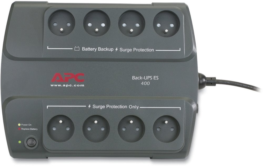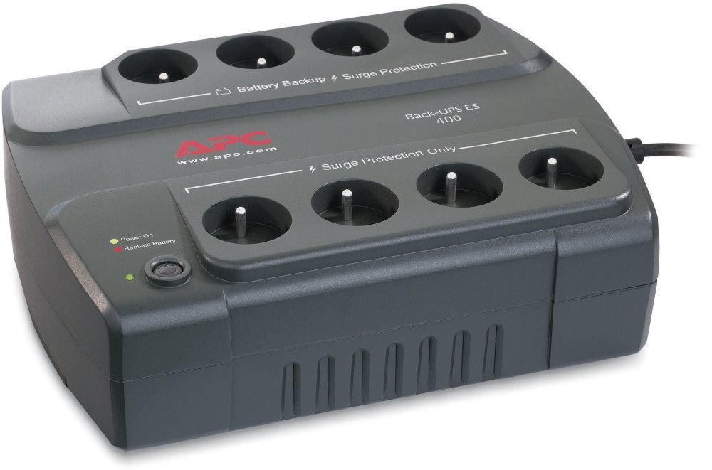 APC BackUPS 400VA; Záložní zdroj umožňuje připojení až osmi zařízení pomocí zásuvek francouzského typu a všechny je chránit proti přepětí , čtyři z nich je možné záložně napájet. Přepěťová ochrana je též dostup...