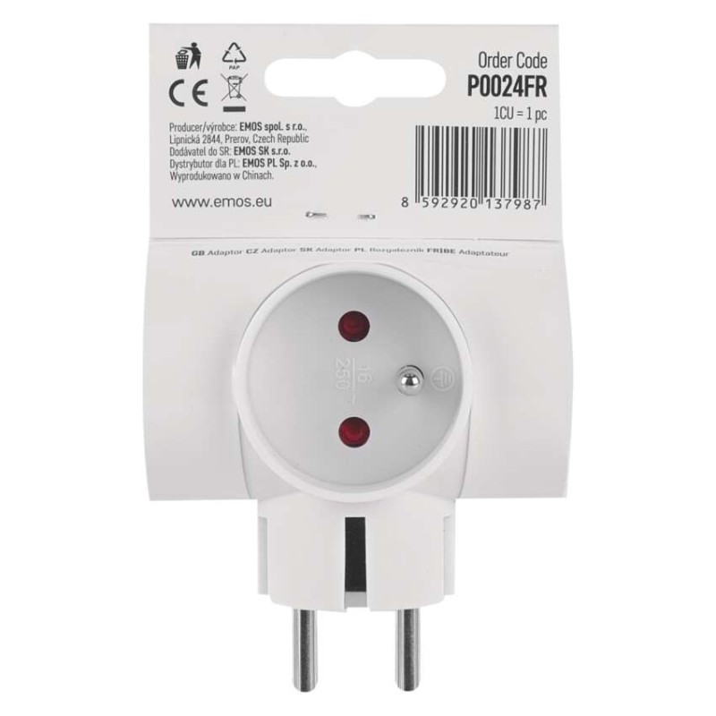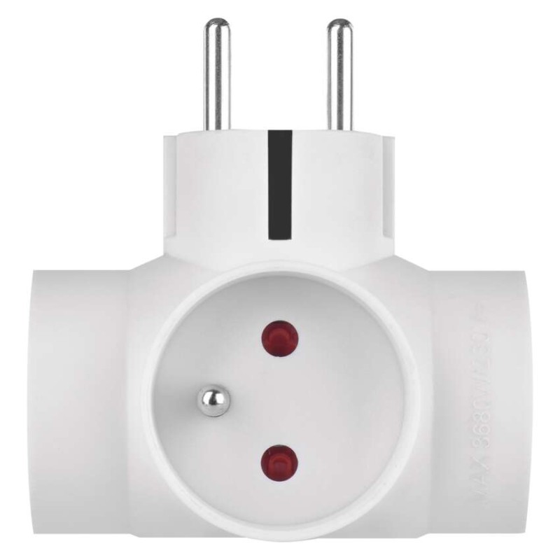 detské clonky: áno|diaľkový ovládač: nie|dosah signálu: –|easy learning: nie|farba: biela|krytie: IP20|materiál: plast|max. záťaž: 3 680 W|možnosť ovládania: nie|napätie/prúd: 250 V~/16 A max.|počet pólov: neuvádza sa|počet zásuviek: 3× 2P + PE|pozície ochranného kontaktu: neuvádza sa|predajný obal: 1 ks, záves|prenosová frekvencia: –|produkt: rozbočovacia zásuvka 3×|typ: FRENCH|vonkajšie použitie: nie|vypínač: nie