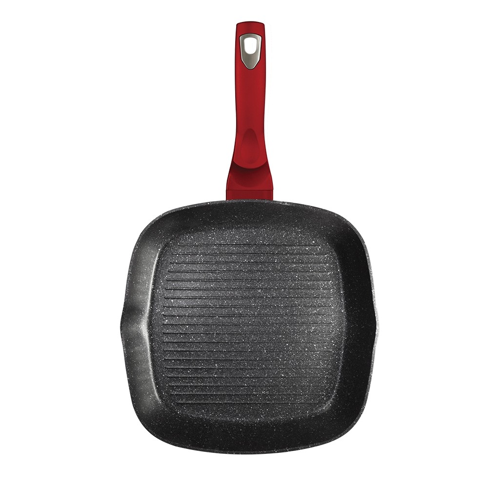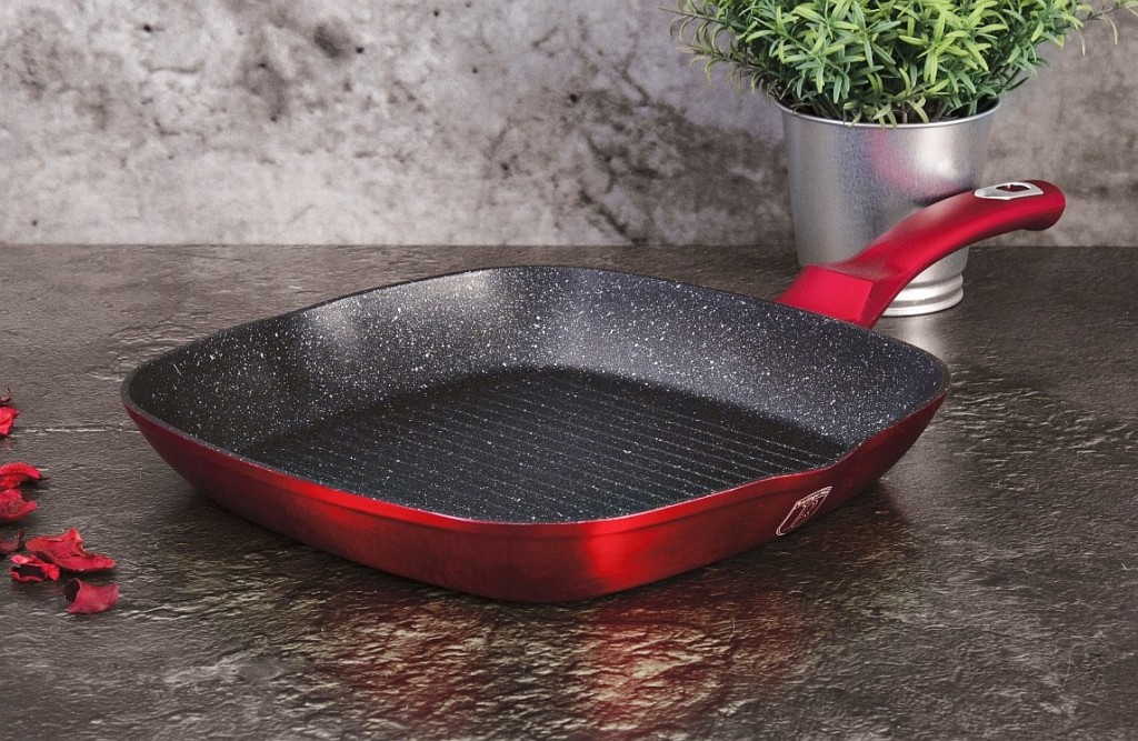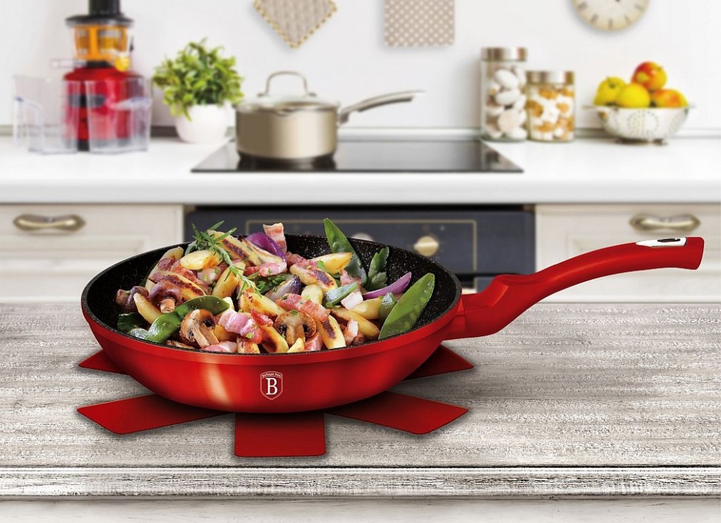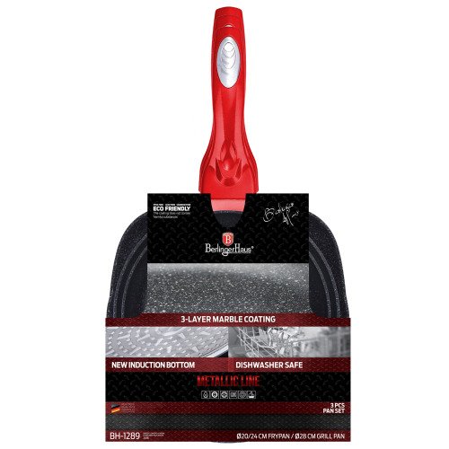Sada pánví Berlingerhaus BH-1289 Metallic Line v červené barvě disponuje 3 pánvemi o průměru 20, 24 a grilovací 28 cm s 3 vrstvým mramorovým povrchem, který je nepřilnavý a vhodný pro vaření s minimem tuku.