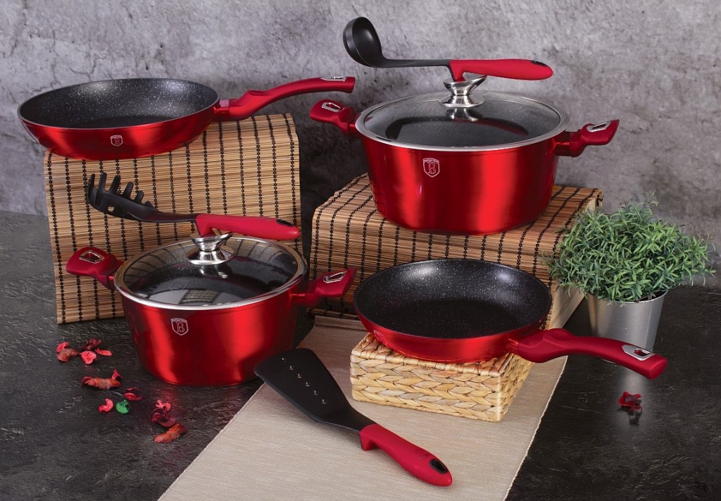Bohatě vybavená sada nádobí značky Berlingerhaus edice Burgundy Metallic Line se skládá celkem ze 18 kusů nádobí a kuchyňského náčiní. Doménou této sady je 3vrstvý povrch s mramorovým designem charakteristický svou dokonalou nepřilnavostí, žádné potraviny se nepřipalují a díky tomu se kastroly i pánve velice snadno čistí. Zároveň je vhodný pro zdravé vaření s minimem tuku nebo oleje a můžete uspořit až 35 % energie a času oproti obyčejným nerezovým kastrolům.