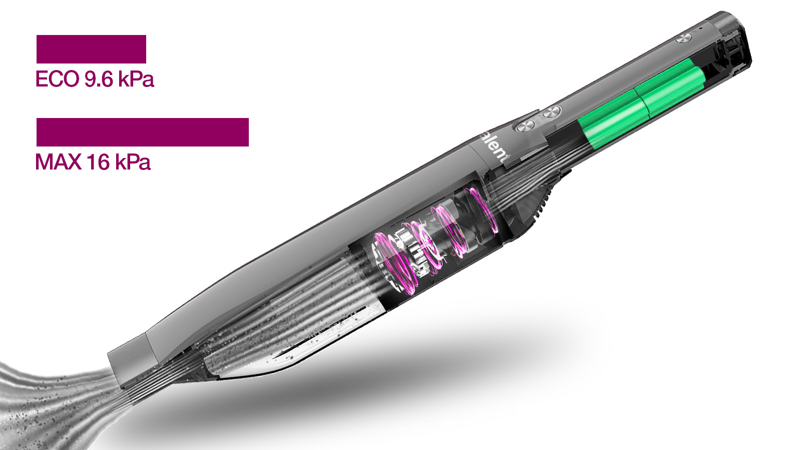 Vysavač Salente HandyPlus disponuje vysokým sacím výkonem, který v případě režimu ECO nabízí 9,6 kPa a v režimu MAX dokonce 16 kPa. Snadno tak vysajete všechny nečistoty ve vaší domácnosti nebo kanceláři.