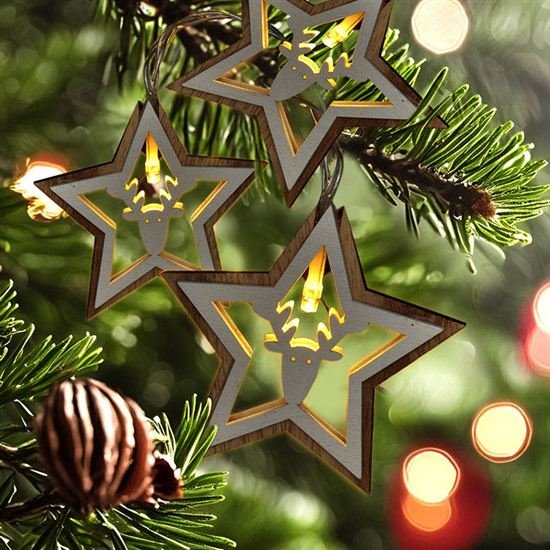 vianočná dekoratívna reťaz s drevenými hviezdami a LED diódami