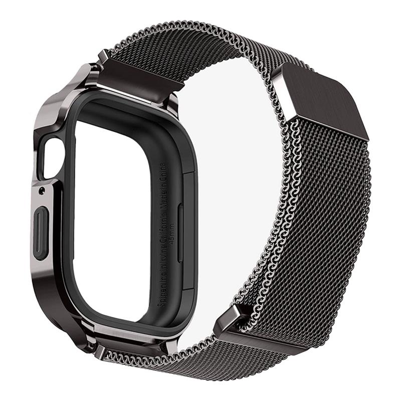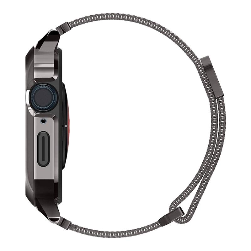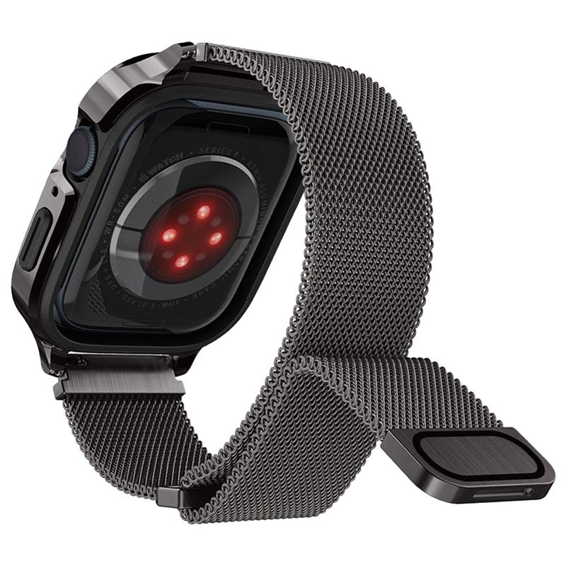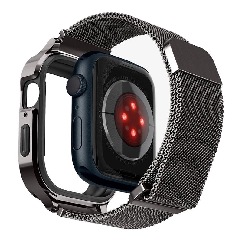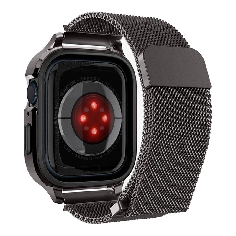 Náramok s ochranným puzdrom pre Apple Watch 7 / 8 / 9 45 mm - hliníkový rám v spojení s TPU pre lepšiu odolnosť - špeciálny remienok vyrobený z prvotriednej ocele - presné výrezy pre ľahký prístup k bočnému tlačidlu a Digital Crown - magnetická spona pre bezpečné prichytenie - určené pre Apple Watch 7 / 8 / 9 45 mm