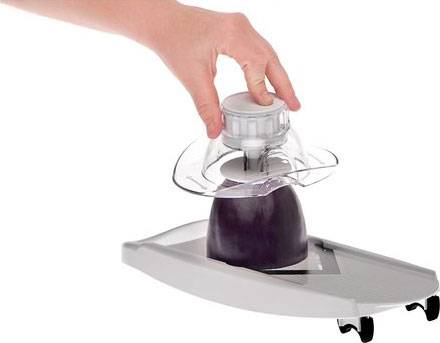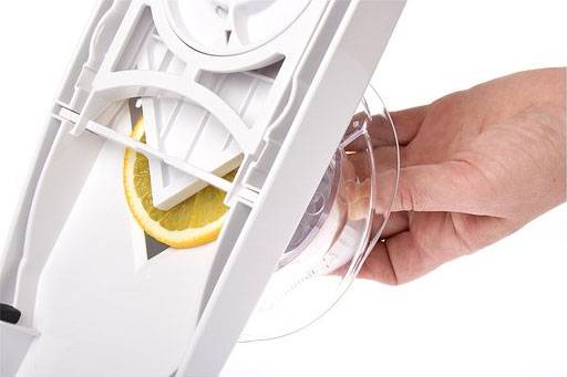 - Obsahuje šikovný držiak, ktorý pevne drží potraviny počas krájania a chráni prsty pred poranením.