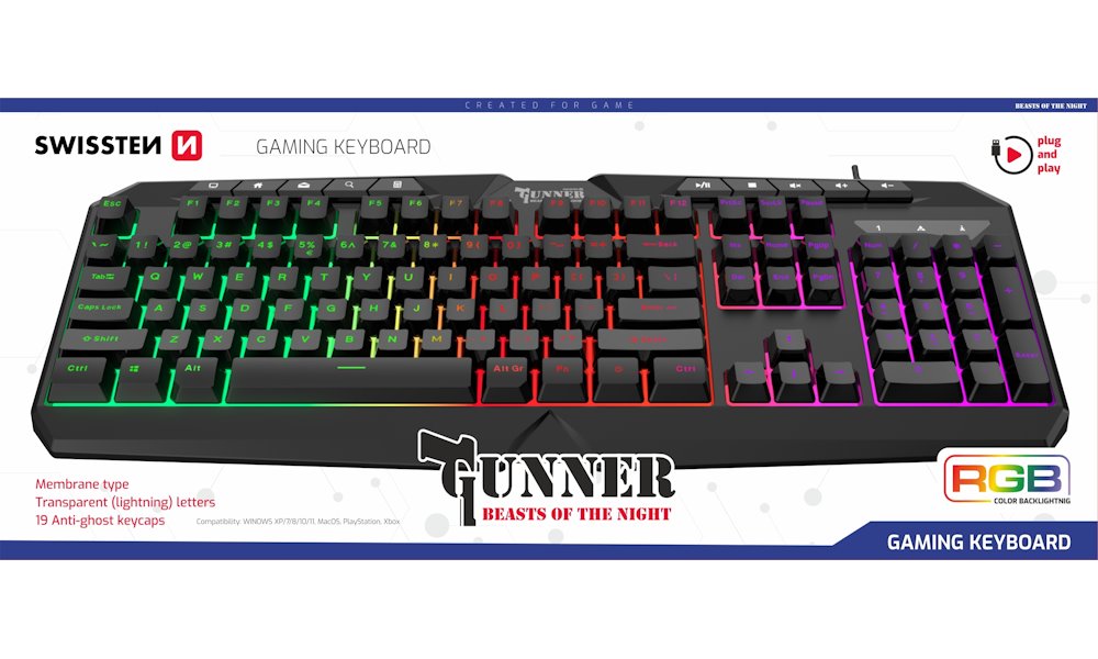 SWISSTEN herní klávesnice GUNNER; Herní drátová klávesnice nabízí vysokoprofilové membránové klávesy s životností až 50 milionů kliknutí. Herní design doplňuje RGB podsvícení se třemi profily, které zaji...