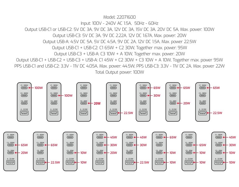 Společný výkon USB-C1 a USB-C2 a USB-C3 + USB-A: 45W + 30W + 20W / Max. 95W