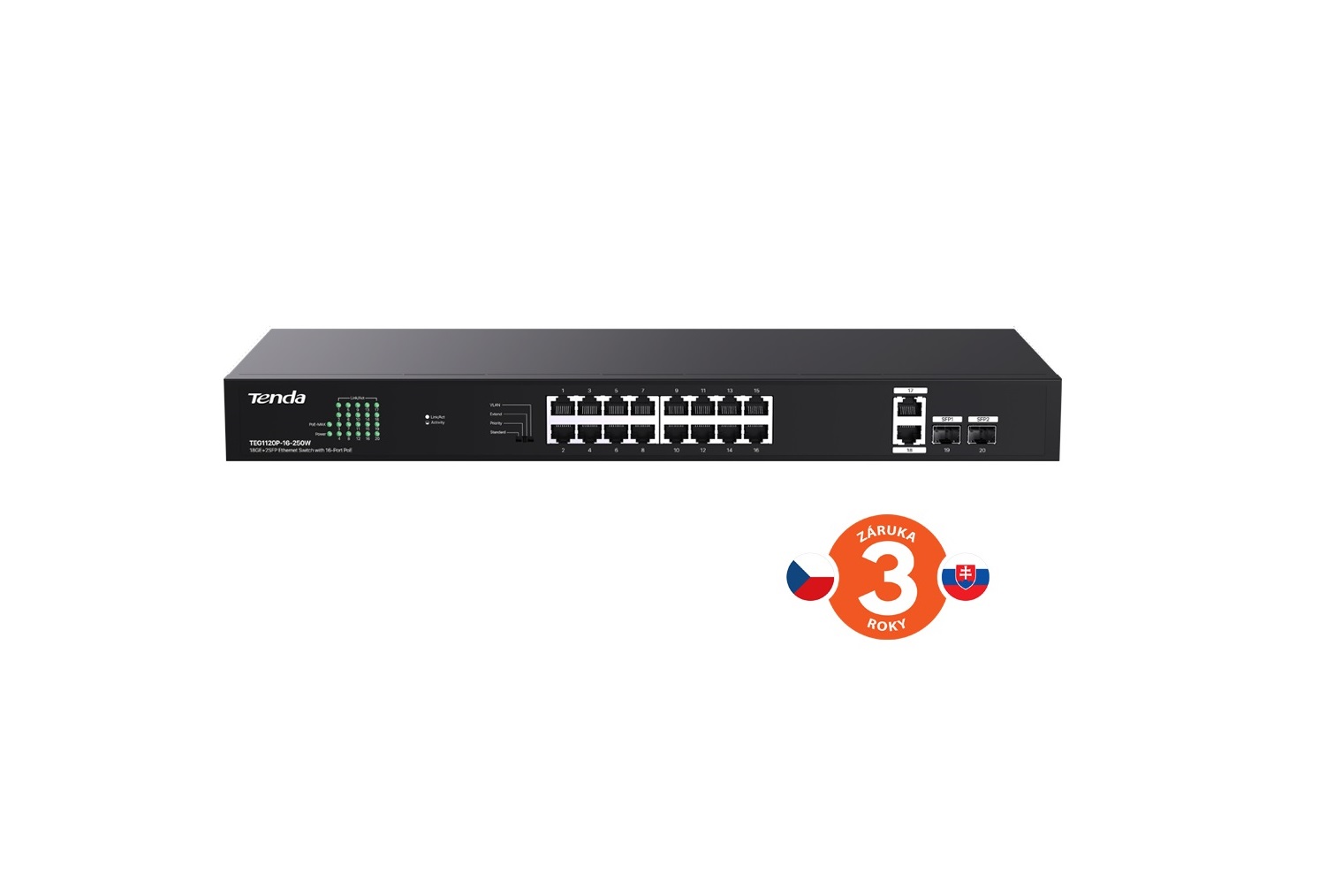 Tenda TEG1120P-16-250W PoE+ Gigabit switch 16x 1Gb/s PoE+ 802.3af/at + 2x SFP + 2x RJ45, 230W, Rack 75011996