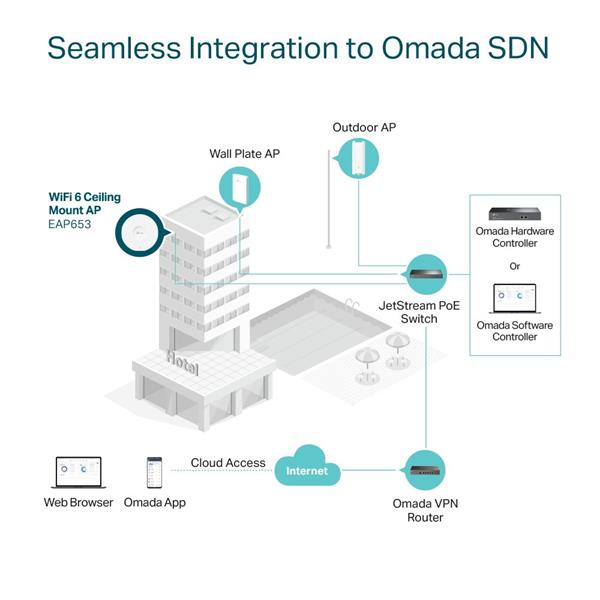 TP-Link Omada EAP653 V1 - Bezdrátový access point - Wi-Fi 6 - 2.4 GHz, 5 GHz - napájení DC - spravování cloudem - nástěnná/stropní montážBezdrátový access point - Wi-Fi 6 - 2.4 GHz, 5 GHz - napájení DC - spravování cloudem - nástěnná/stropní montáž