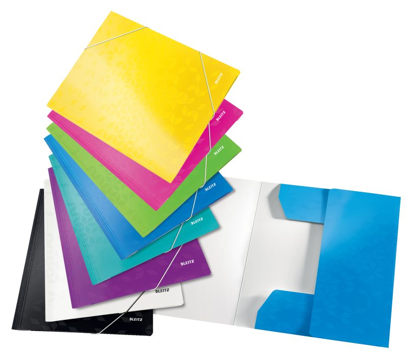 Kartonové desky na dokumenty Leitz WOW Tříchlopňové desky na volné papíry a dokumenty v zářivých barvách, které zaujmou na první pohled. Díky laminaci je povrch desek lesklý a vysoce kvalitní. Laminovaný karton se vzorem. Uzavírání na gumičku. Kapac