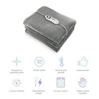 Vysoce skladná nahřívací deka, 180 × 130 cm, 6 stupňů teplot, prémiový mikrofleece, automatické vypnutí, dlouhý kabel 3,5 m, rychlé a rovnoměrné nahřívání, časovač 1–12 hodin a nízkou spotřebu