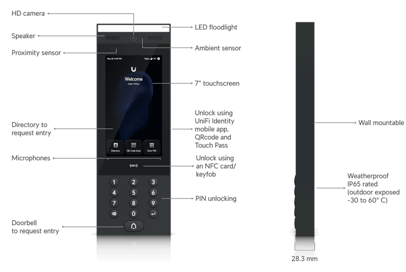 Indoor/outdoor intercom terminal for managing residential and commercial building entry requests with Touch Pass support. Unlock using Apple Wallet or an NFC card or UniFi Identity mobile app, face unlock and Touch Pass* Directory and doorbell to reque...