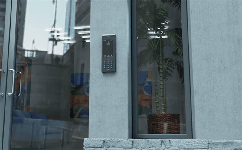 Indoor/outdoor intercom terminal for managing residential and commercial building entry requests with Touch Pass support.