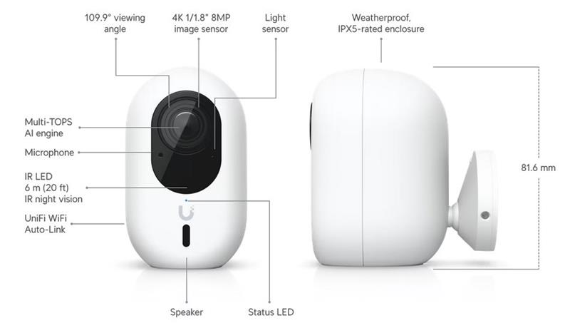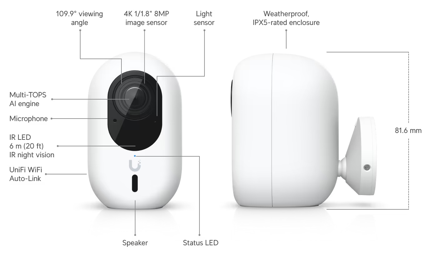 Ubiquiti Plug-and-play, 4K WiFi-connected camera with a 1/1.8" 8MP image sensor, Multi-TOPS AI Engine, and UVC-G6-INS-W