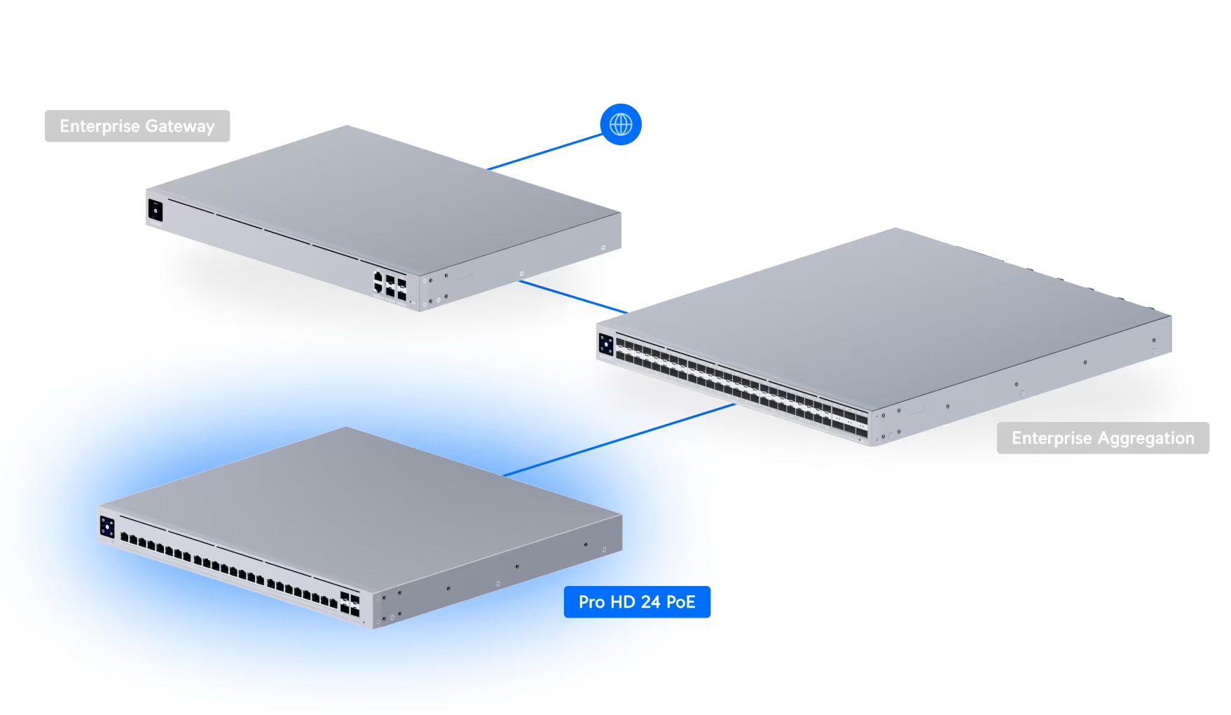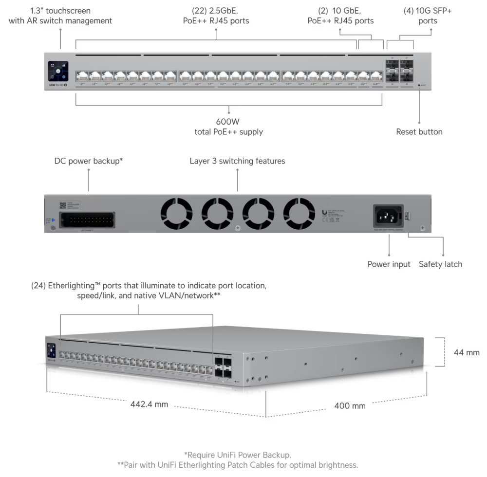 • Ubiquiti Professional-grade, Layer 3 Etherlighting™ switch with (2) 10 GbE PoE++, (22) 2.5 GbE PoE++, USW-Pro-HD-24-PoE