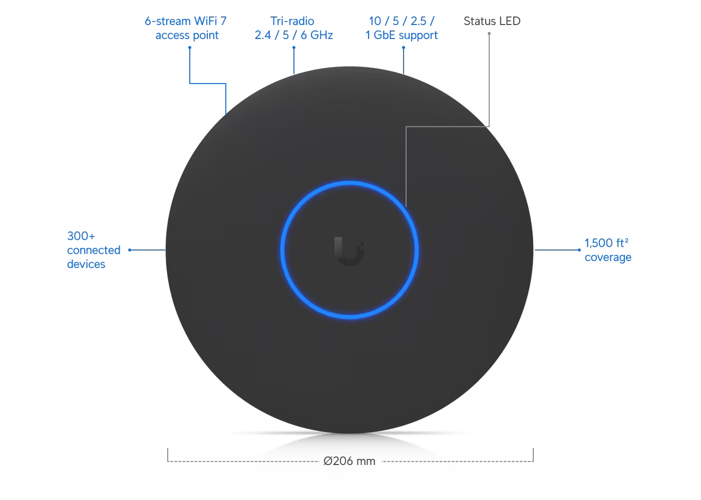Popis produktu Ubiquiti U7-Pro-XG je nový WiFi 7 UniFi AP. Jedná se o tri-band access point s rychlostí přenosu 5,8Gbps v pásmu 6GHz, až 4,3Gbps v 5GHz pásmu a až 688 Mbps v pásmu 2,4GHz a pokročilým šifrováním WPA3. U7-Pro-XG je určeno k WiFi pokrytí vaší domácnosti, kanceláře, hotelových prostor nebo skladu s podporou až 300+ připojených klientů. Plná podpora roamingu zajišťuje plynulé předávání připojených klientů mezi jednotlivými AP. Pro připojení do sítě je AP vybaveno 10G ETH portem, který slouží i pro napájení pomocí PoE 802.3at nebo pasivním PoE v rozsahu 42,5-57V DC, PoE injektor není součástí balení. Výhody UniFi řešení • Roaming - přechod mezi jednotlivými AP bez výpadků • Wireless uplink – ideální pro místa, kam nelze přivést datový kabel • Až 8 SSID • Detailní statistiky provozu • Guest síť • Load balancing - udržování rovnoměné zátěže / přepínání klientů • Omezování rychlosti pro každé SSID Obsah balení • Zařízení • Kit k přichycení na strop • Sada šroubků Technické parametry Bezdrátové vlastnosti Bezdrátové frekvence:2.4 + 5 + 6 GHz (triple band) WiFi standardy:802.11n, 802.11a, 802.11ac, 802.11b/g, 802.11ax, 802.11be MU-MIMO:Ano Přenosová rychlost - 5GHz [Mb/s]:4300 Přenosová rychlost - 2.4GHz [Mb/s]:688 Přenosová rychlost - 6GHz [Mb/s]:5800 Vysílací výkon 2.4GHz [dBm]:23 Vysílací výkon 5GHz [dBm]:26 Vysílací výkon 6GHz [dBm]:24 Šifrování:WPA, WPA2, WPA3 2.4GHz MIMO:2 x 2 5GHz MIMO:2 x 2 6GHz MIMO:2 x 2 Typ antény:Vestavěná Počet vestavěných antén:6 Roaming:Ano Zisk antény [dBi]:6, 4, 5 Konektory a rozhraní Rychlost LAN:(1) 100M/1G/2.5G/5G/10G Gigabit LAN:Ano Napájení Napájení přes PoE:802.3at, 42 .. 57V DC Typy PoE:PoE-In (pouze) Max. spotřeba energie [W]:22 Fyzické charakteristiky Použití:Vnitřní Tlačítka:Reset Provozní teplota [°C]:-30 až 40 Hmotnost [g]:750 Šířka [mm]:206 Výška [mm]:206 Hloubka [mm]:33 Software Operační mód:Access Point Výchozí IP adresa:192.168.1.20, Dynamická z DHCP