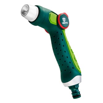 Pištoľový postrekovač značky Verto umožňuje nastavenie prietoku vody palcom. Nastaviteľná hlava umožňuje nastavenie tvaru prúdu vody od hmlistého prúdu až po silný prúd. Ergonomická rukoväť skvele padne do ruky a nekĺže, čo zvyšuje komfort pri práci.