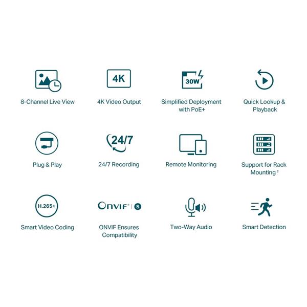 VIGI NVR1008H-8P Shows more details with up to 8MP resolution for one channel and 16MP decoding capacity in total for all channels. Features 8× 10/100Mbps PoE+ ports, the NVR supports up to 30 W on each PoE+ port. Designed to use a single Ethernet cabl...
