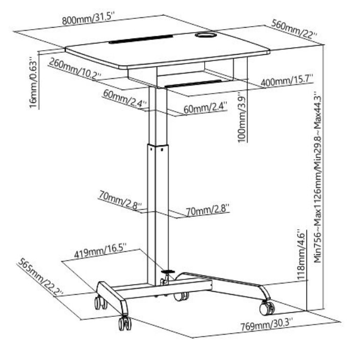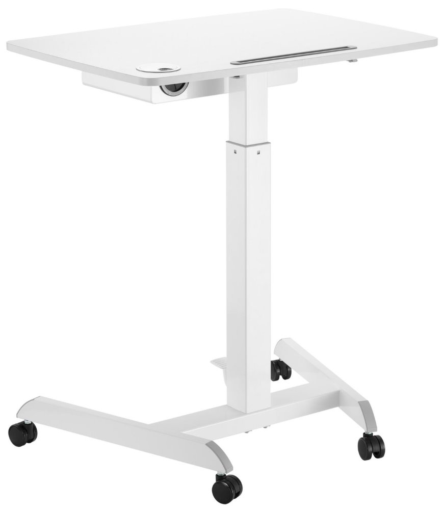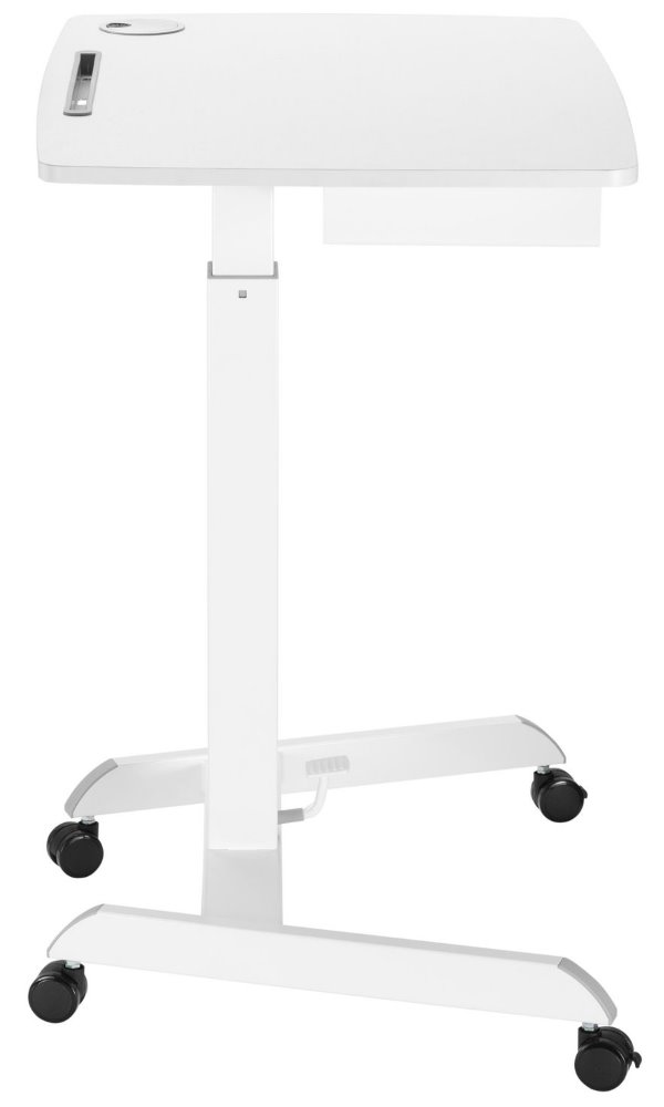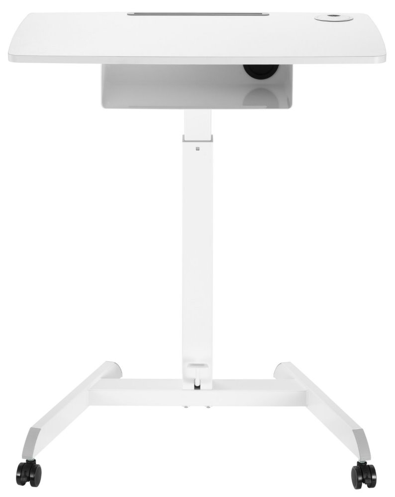 Výškově nastavitelná mobilní pracovní stanice/stolek se zásuvkou. Na horní desce disponuje drážkou pro telefony či tablety a k dispozici je také zabudované vedení kabelů. Pneumatický nožní pedál umožňuje nastavení výšky v rozsahu 756 až 1126 mm. Ideální do kanceláře, školy nebo učebny, konferenční místnosti, na školení či veletrh.