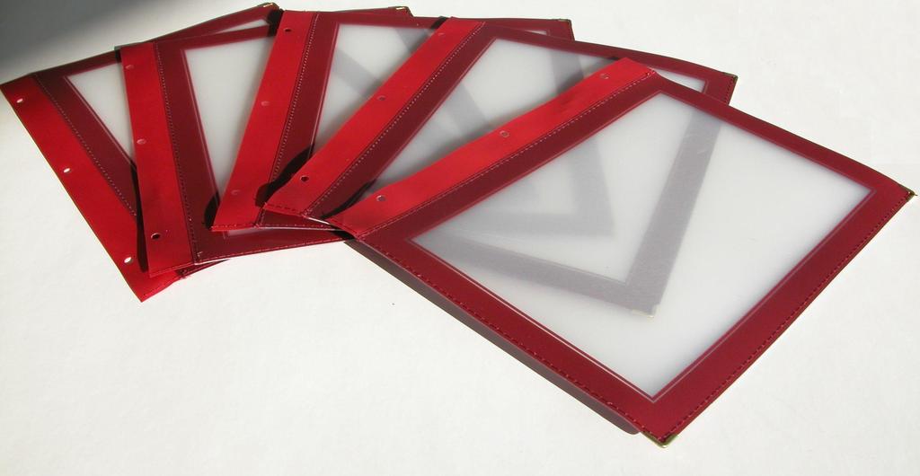 Průhledné vyměnitelné vložky k designovým jídelním lístkům série WOOD mají vínově barevný rámeček a formát A5. Upevnění jednotlivých listů do dřevěného hřbetu umožňuje tyto průhledné vložky doplňovat a měnit. Každý "jídelák" obsahuje v základu dvě oboustranné vložky (4 strany nabídky).