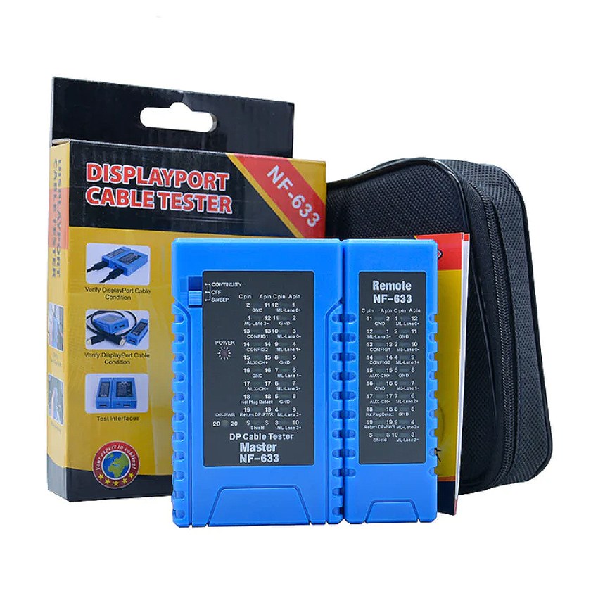 Multi tester kabelů DispayPort WSNF633 slouží k rychlému a spolehlivému testování kabelů DP standard VESA 1.0 a 1.1a s konektory DisplayPort a mini DisplayPort. VASTNOSTI: Zobrazení stavu: 19 LED diod a stínící dioda na hlavní i vzdálené jednotce, 1 dioda detekující napájení na kabelech. Zvuková signalizace: Ano Typ testovaných kabelů: DisplayPort s konektorem samec a mini DisplayPort s konektorem samec, a test stínění Vstupy: DisplayPort samice, mini DisplayPort samice (hlavní i ukončovací jednotka) Max délka kabelu: max. 50m Testovací mody: rychlý, pomalý, kontinuální, manuální, smyčka Rozměry hlavní jednotka: 103x66x27 mm Vzdálená jednotka: 103x35x27mm Napájení: 9V baterie (není součástí dodávky) Indikátor slabé bateie: ano, 6V Váha: 250g
