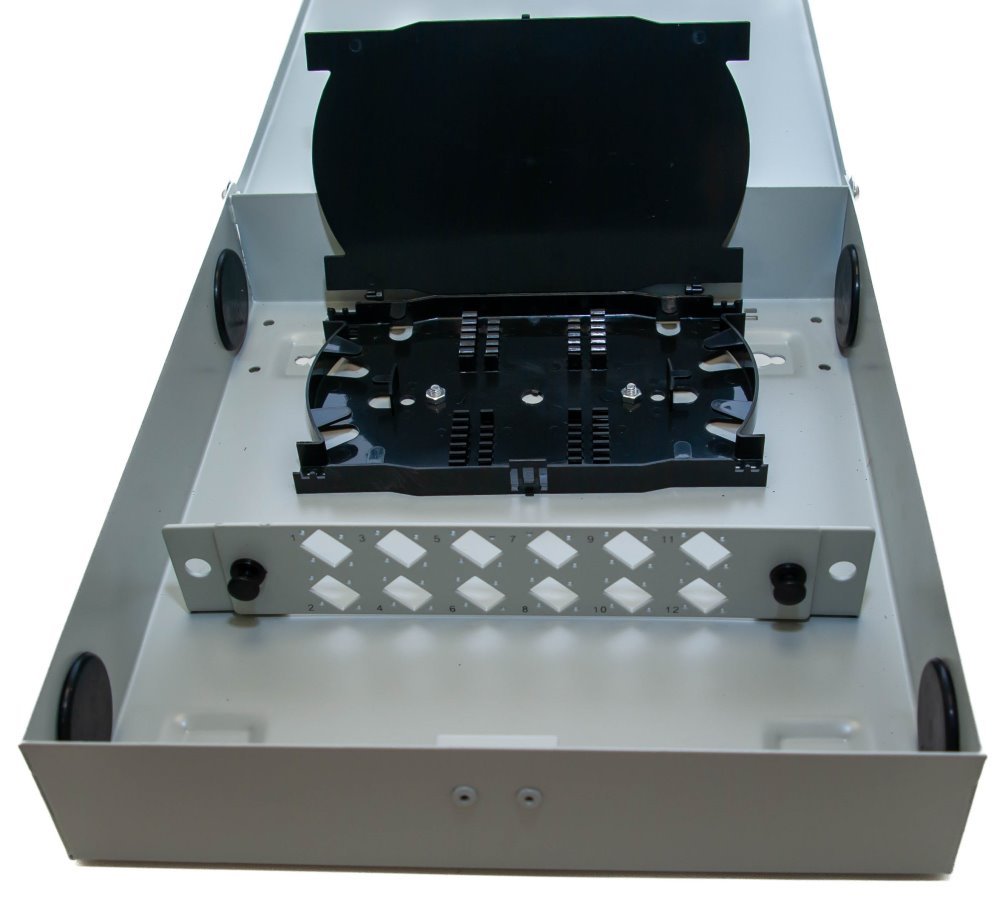 Nástěnný optický rozvaděč pro 12 simplex adaptérů SC nebo 12 dual LC adaptérů, kovová skříň, kazeta na svarky.