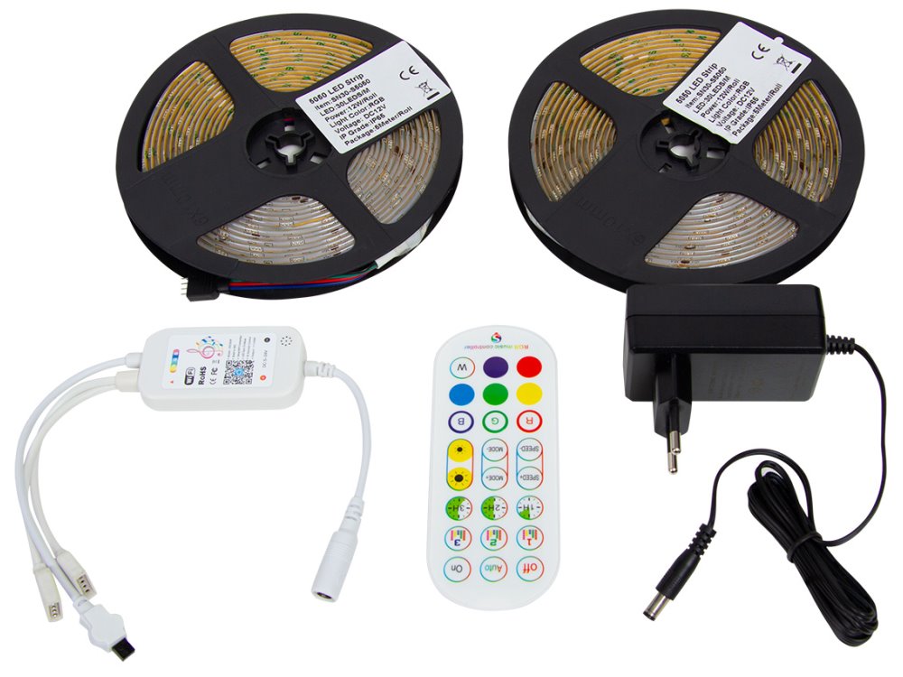 Rozměry: LED pásek 5000 x 10 x 2,7 mm, řídicí modul 68 x 35 x 11 mm, dálkový ovladač 124 x 50 x 8 mm