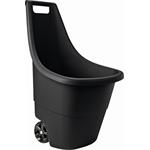 Zahradní koš na kolečkách pro vnitřní i venkovní využití, pevná konstrukce z umělé pryskyřice, odolnost vůči povětrnostním vlivům a UV záření, nosnost až 50 kg, objem 50 l, nízká hmotnost 1,8 kg pro dobrou ovladatelnost. Černá barva.