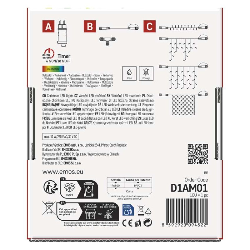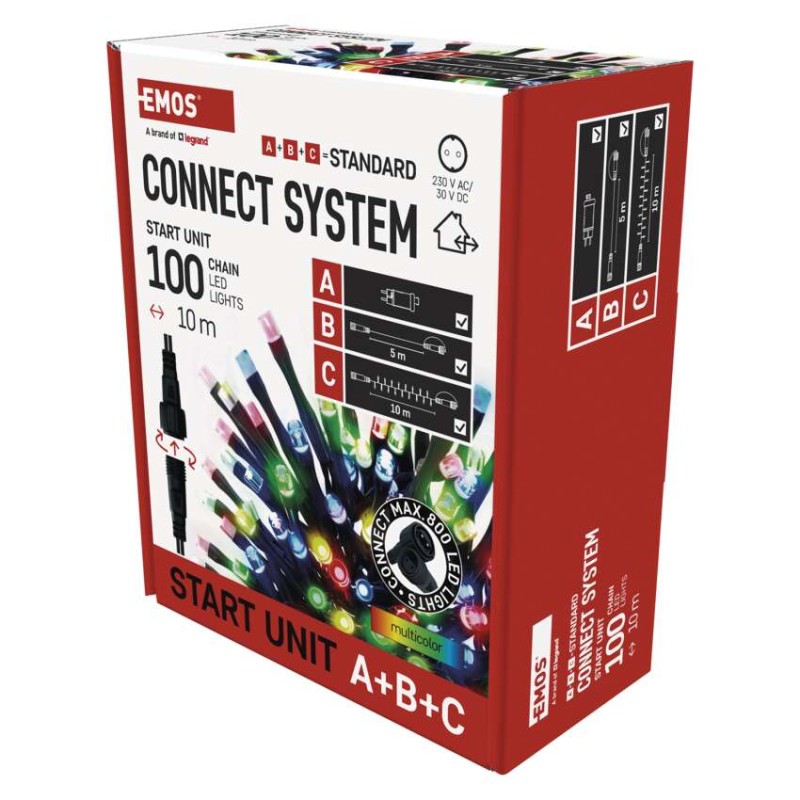 časovač: áno|diaľkový ovládač: nie|dĺžka prívodu: 5 m|farba drôtu: čierna|farba svetla: multicolor|funkcia: svieti|krytie: IP44|LED medzera: 10 cm|materiál: PVC|možnosť prepojenia: áno|počet LED: 100|použitie: vonkajšie aj vnútorné|predajný obal: 1 ks, krabica|pre výšku stromu: neuvádza sa|príkon: max. 12 W|produkt: spojovací reťaz s napájacím zdrojom|rozmer: 10 m|tvar: klasický|typ napájania: sieťový adaptér|veľkosť LED: 5 mm|vstupné napätie: 230 V AC|výstupné napätie: neuvádza sa|záručná doba: 2 roky|životnosť: 10 000 hodín