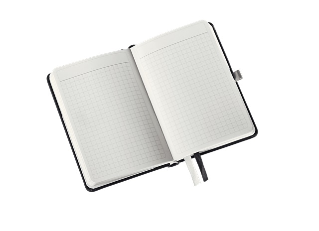 Prémiový zápisník s tvrdými deskami. Formát A6, čtverečkovaný. Uzavírání na gumičku, úchyt na propisku a vnitřní kapsy na volné papíry.